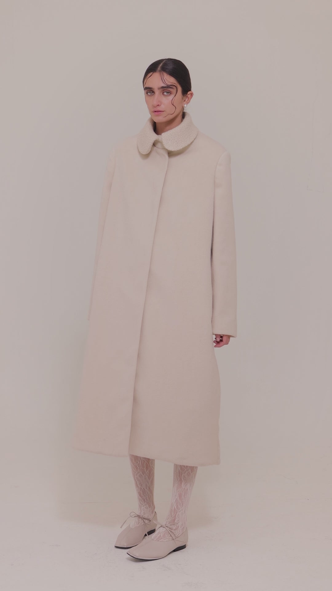 Abrigo recto midi en lana poliester. Cruce frontal con broches. Forro interior. Bolsillos laterales. Cuello y puños desmontables.