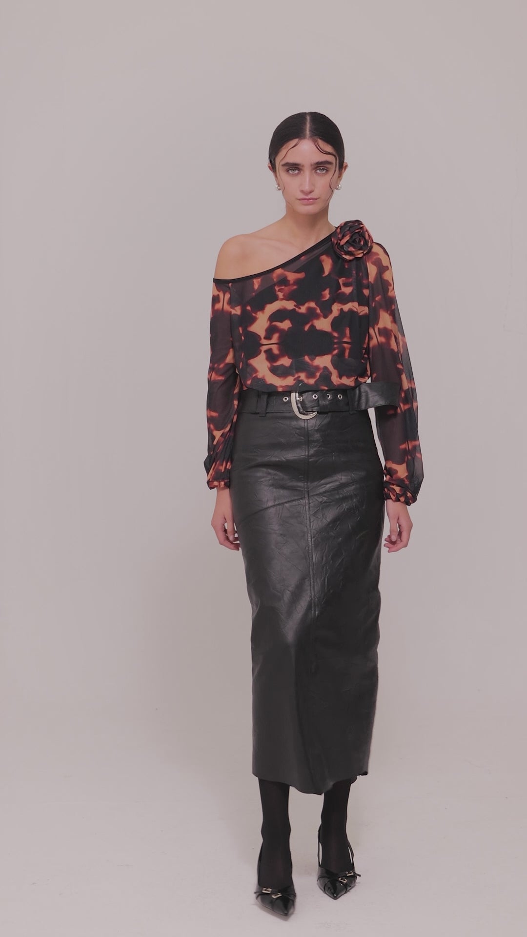 Body off-shoulder asimétrico en lycra fría, con top sobrepuesto de malla estampada. Detalle de flor en hombro. Cierre en entrepierna con broches a presión. Incluye ambas piezas, que pueden utilizarse juntas o por separado.