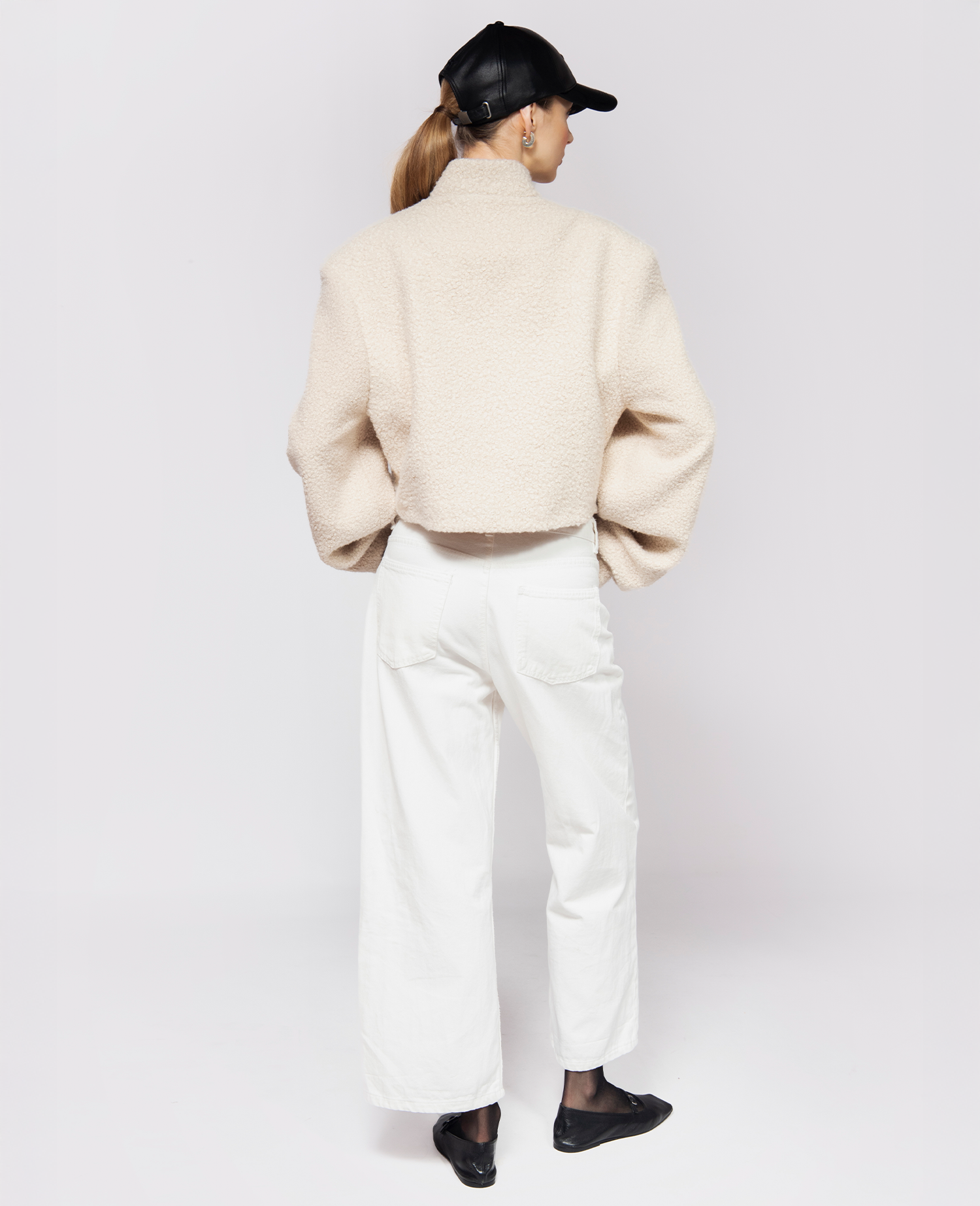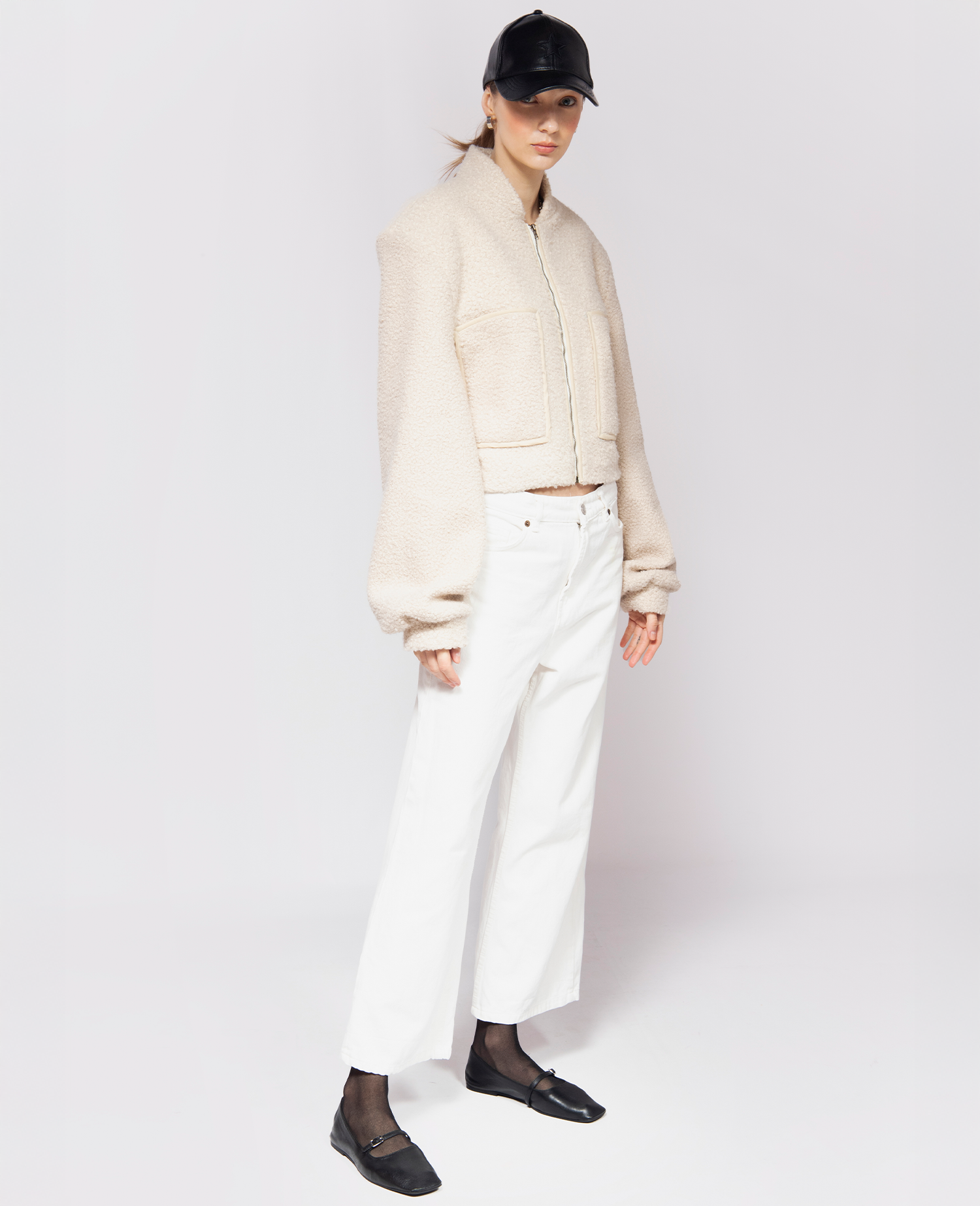 Chaqueta bomber en lana boucle poliéster. Mangas abombadas. Bolsillos delanteros. Apertura frontal con cierre metálico. Forro interior.