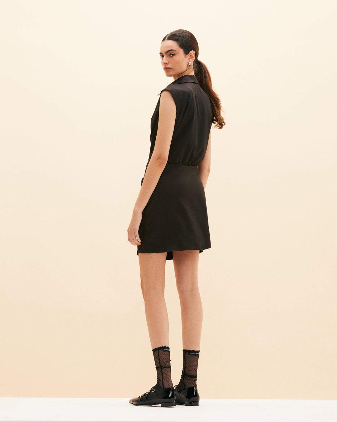 Vestido corto sin mangas. Construido en tela fluida con escote V y frunce en lateral. Lleva cierre invisible en el costado.