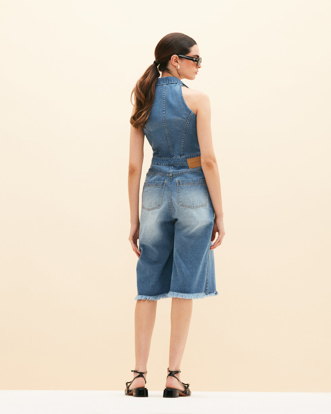 Enterito de jeans sin mangas, con silueta acinturada y detalle de abertura en el centro. Basta deshilada y cierre con boton metálico y marruecos.