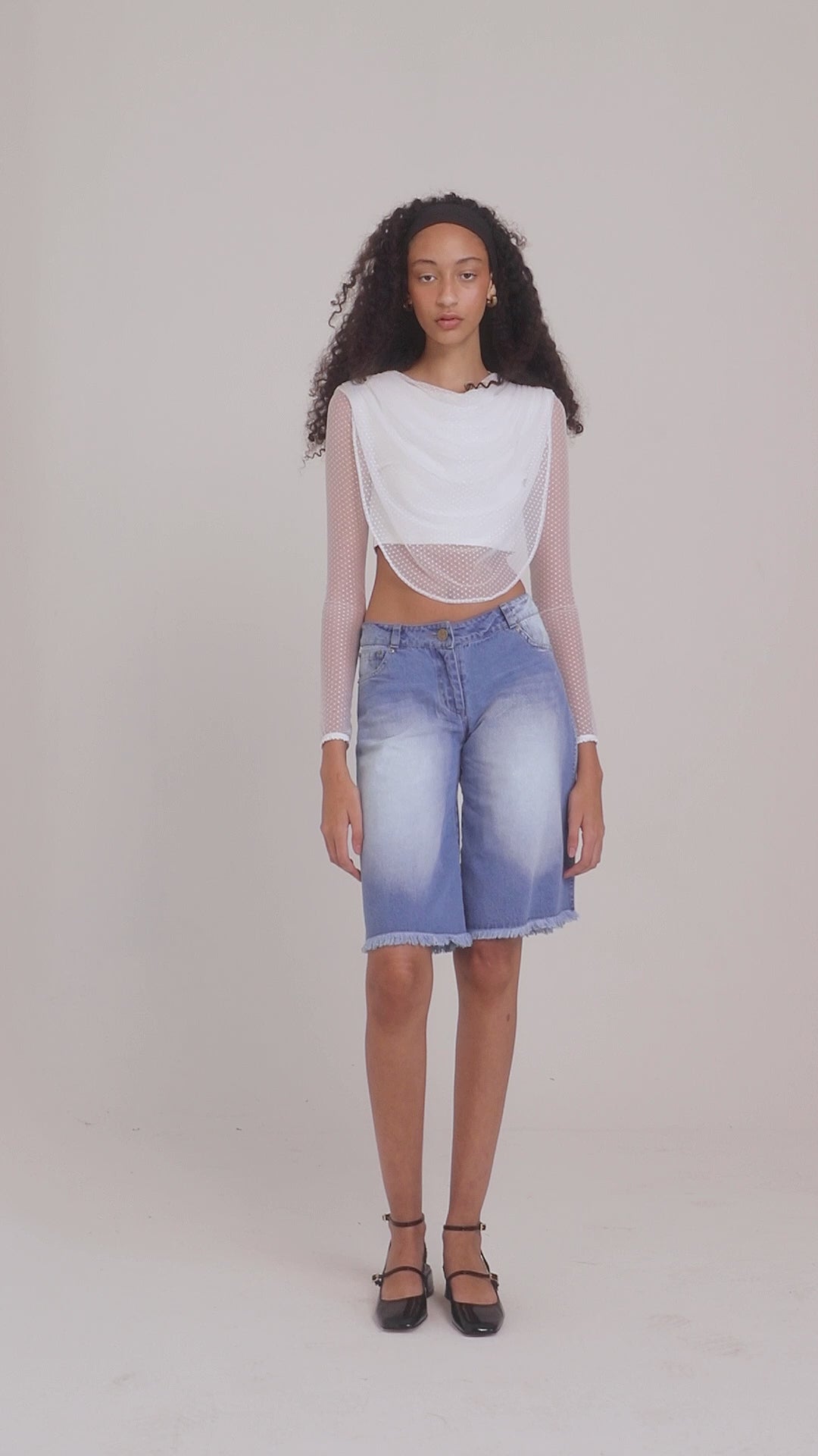 Crop top con drapeado y mangas en malla de puntitos, detalles de terminaciones en vivo elástico con vuelitos. El cuerpo interior es 100% algodón pima.