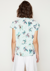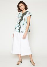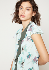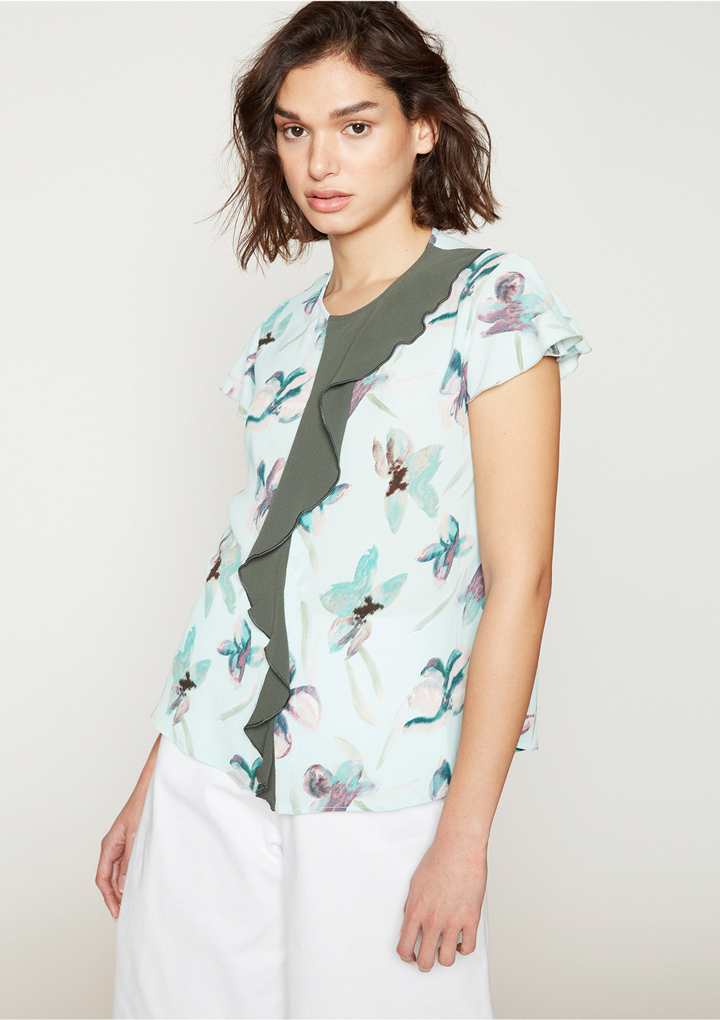 Blusa en crêpe estampado floral con vuelo a contraste. Manga corta. Broches en centro delantero.