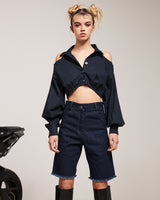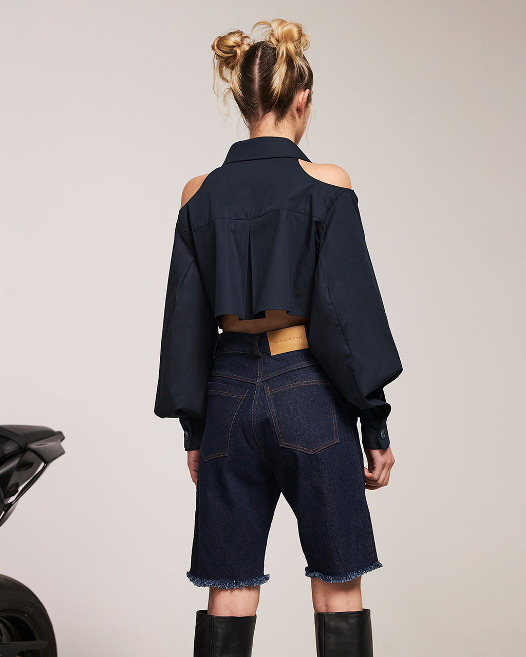 Camisa crop en algodón, con mangas largas y con cuts en hombros. Detalle de tablón en espalda. Apertura con botones delanteros.