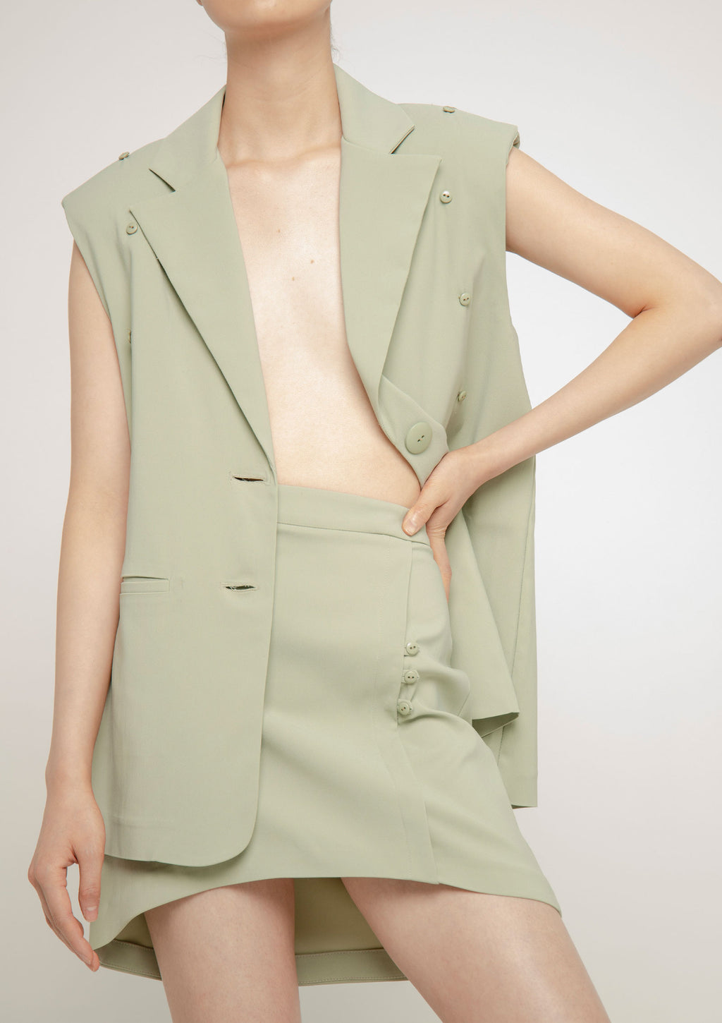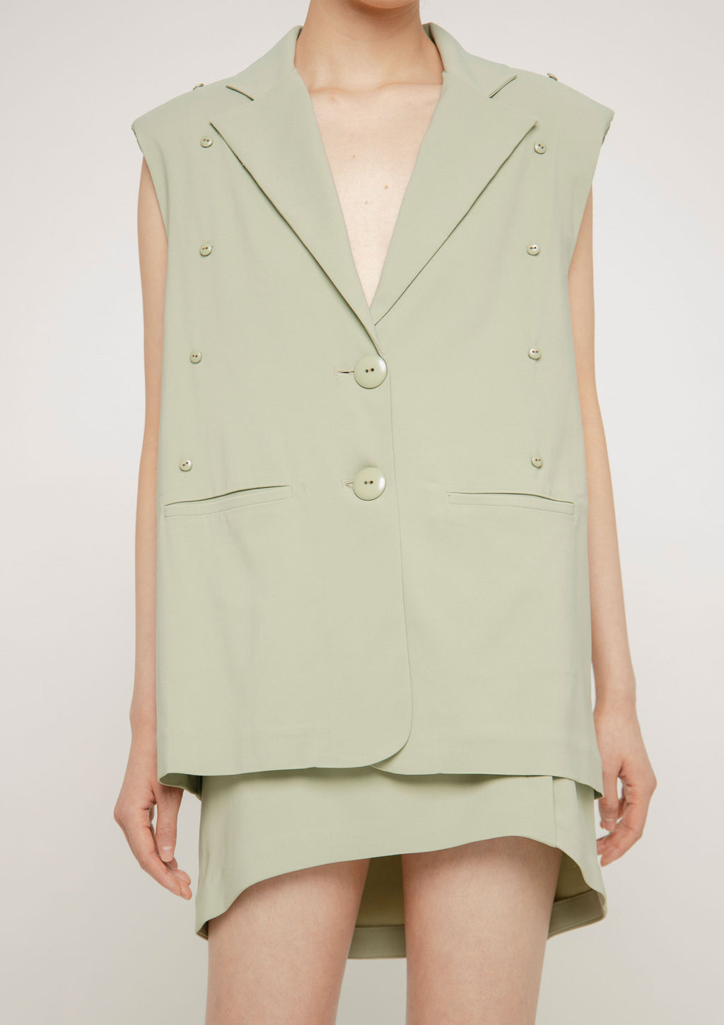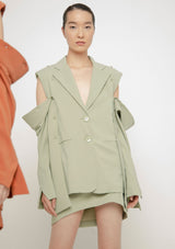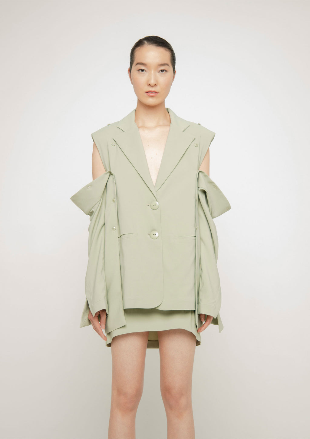 Chaqueta/blazer en crêpè de corte sartorial y estructurada, con mangas largas desmontables. Silueta semi oversize. Cruce ligero y apertura frontal con botones. Detalle de bolsillos ojal de sastre.