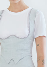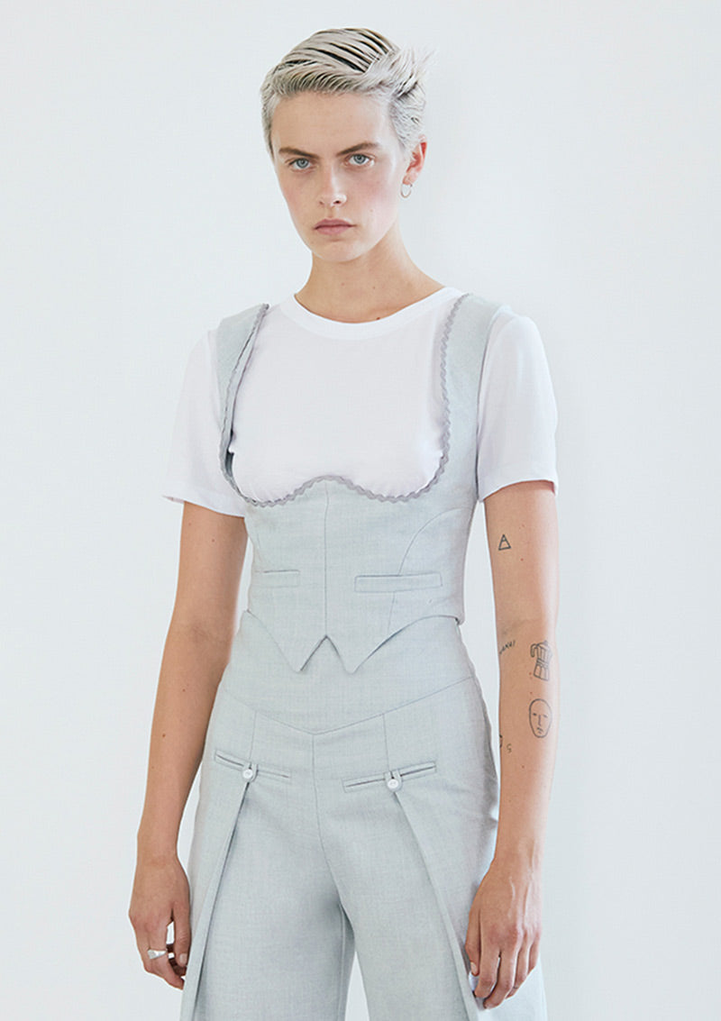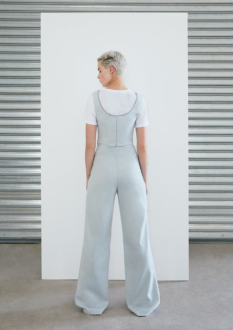 Top tipo Corsé-Gillet, sin mangas, en lana cashmere menta, bajo el busto, con corte princesa y detalles sartoriales. Apertura trasera con cierre invisible.