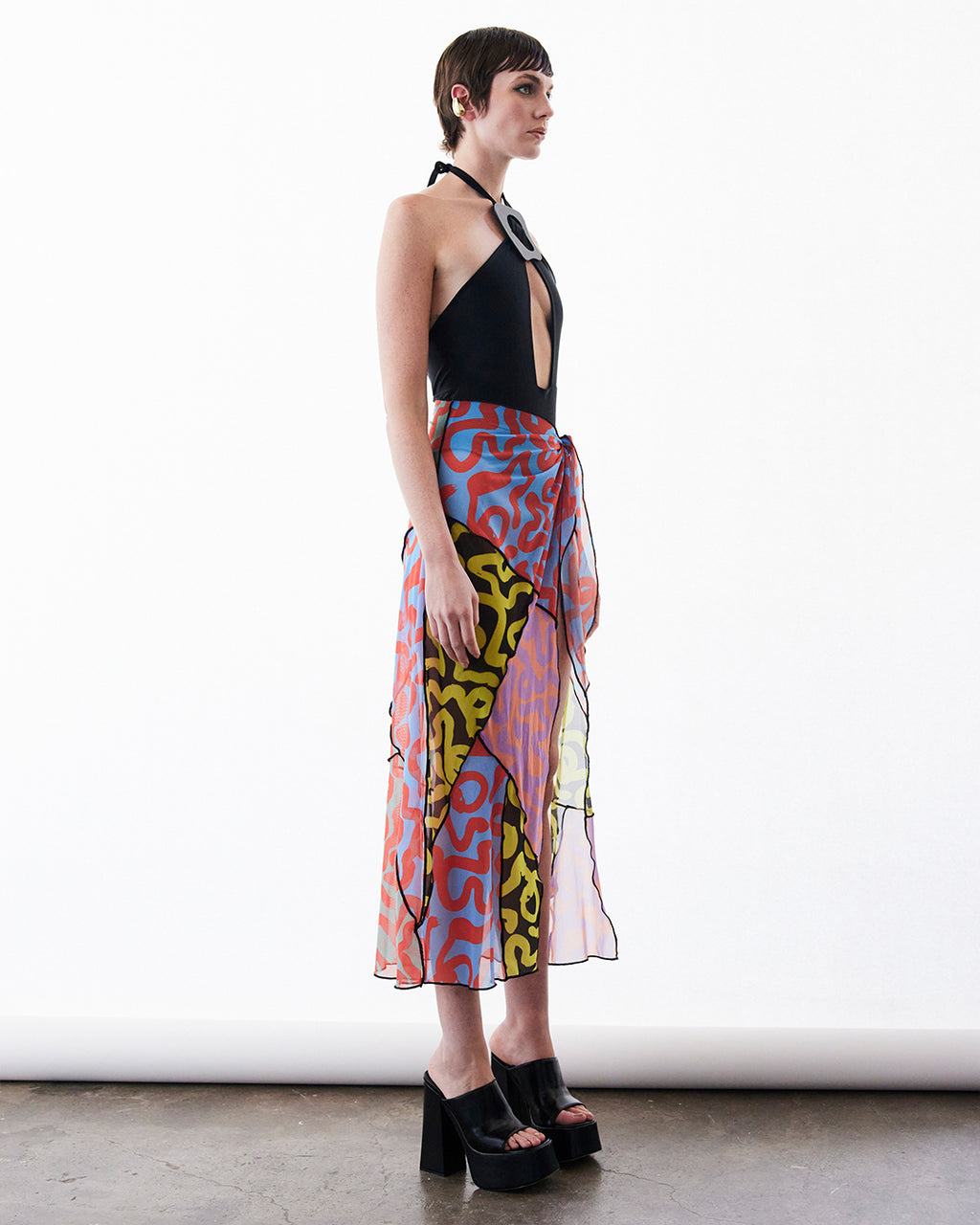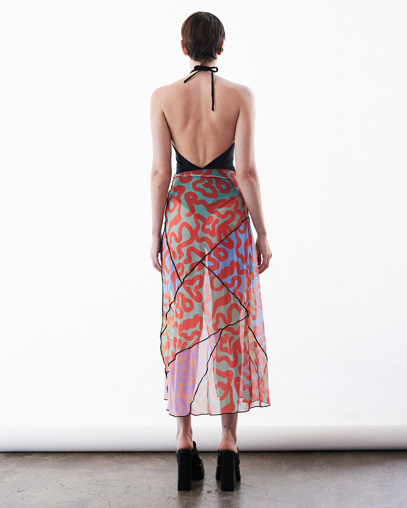 Falda pareo patchwork multicolor en malla elasticada estampada. Detalle de terminaciones en roulé.