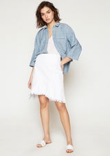 Falda en gabardina con basta deshilachada. Tiro alto con pasadores. Cierre cremallera invisible lateral.