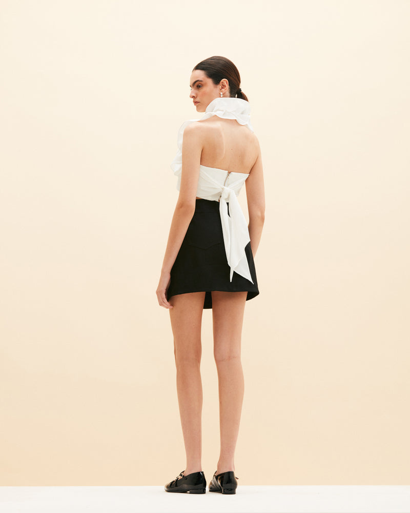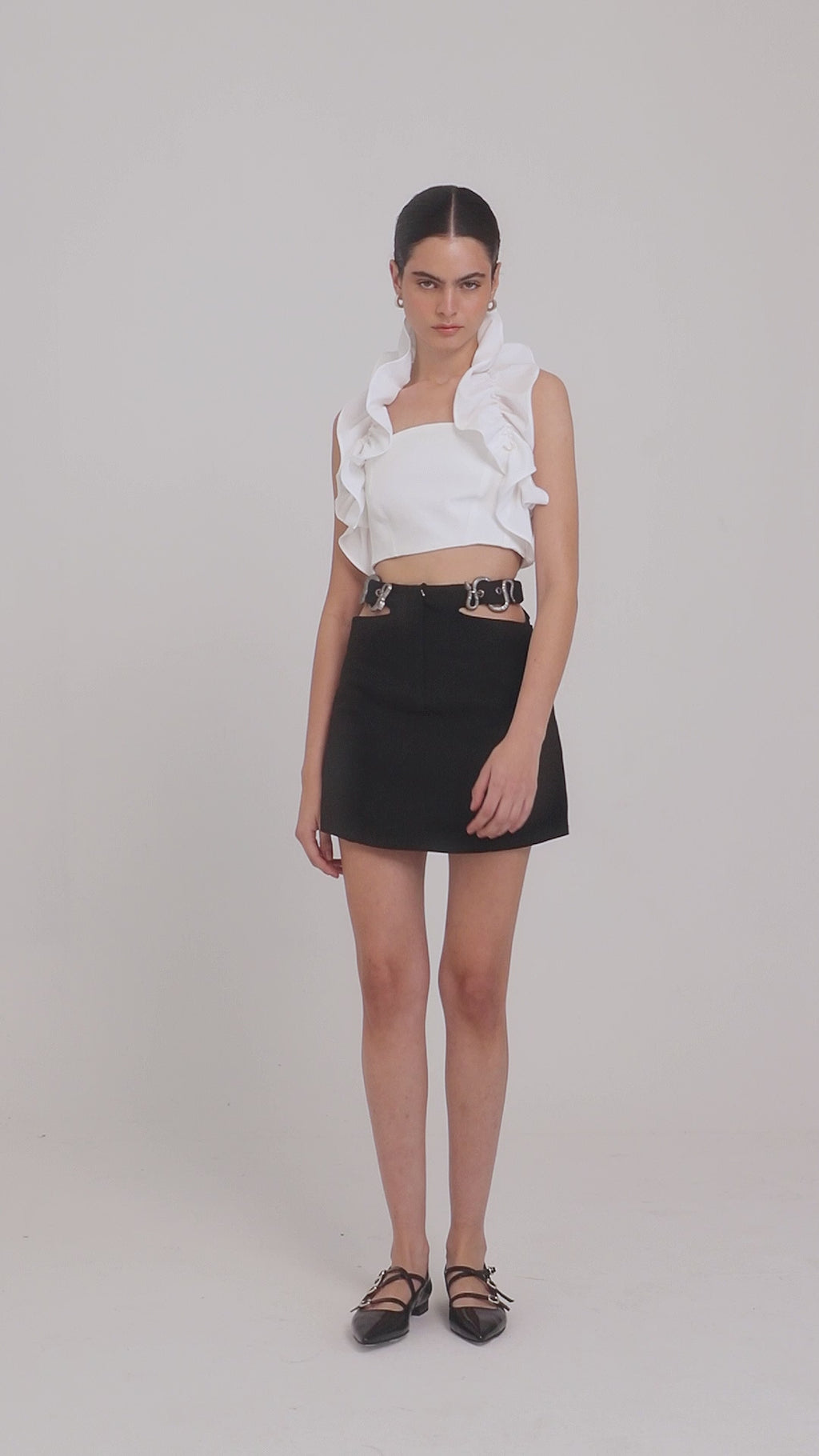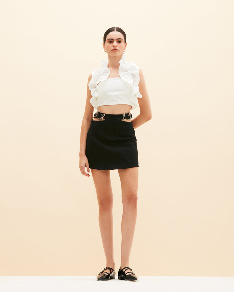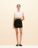 Mini falda 100% algodón, con detalle de aperturas laterales y hebillas de serpiente metálicas. Cierre frontal con cremallera.