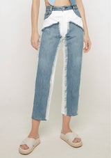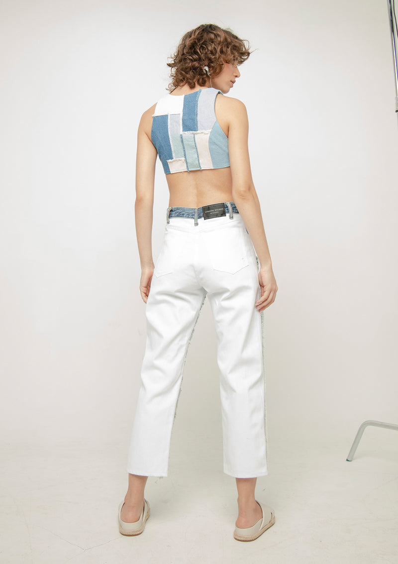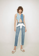 Pantalón en denim estilo cowboy. Cierre frontal cremallera y botón metálico. Bolsillos delanteros. Detalle en máscara delantera deshilada a contraste.