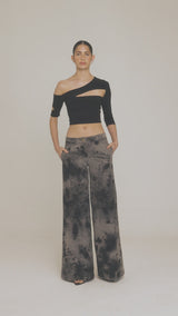 Jeans 100% algodón, de tiro medio, pierna ancha acampanda y lavado efecto tie-dye. Cierre frontal con cremallera y botón metálico LH.
