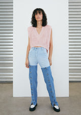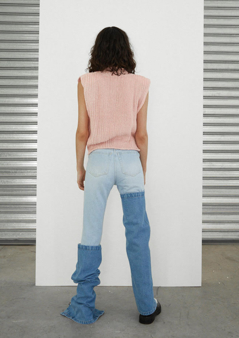 Pantalón clásico tiro alto en denim estilo 'mom-jeans'. Pierna semi slim. Polaina-bucanera en denim superpuesta como accesorio removible. Apertura frontal con marrueco metálico. Bolsillos laterales y traseros. Polainas incluidas, su apertura es delantera con botones metálicos de jeans.