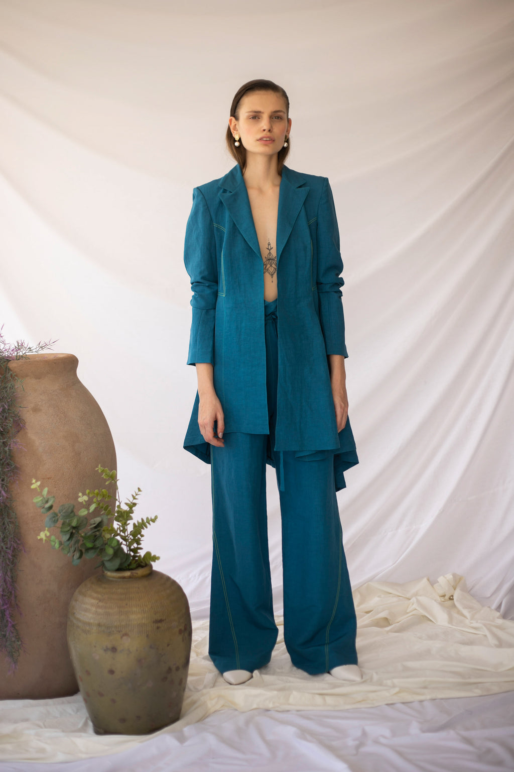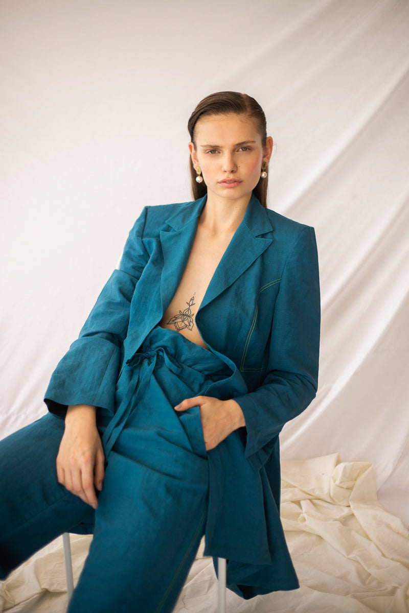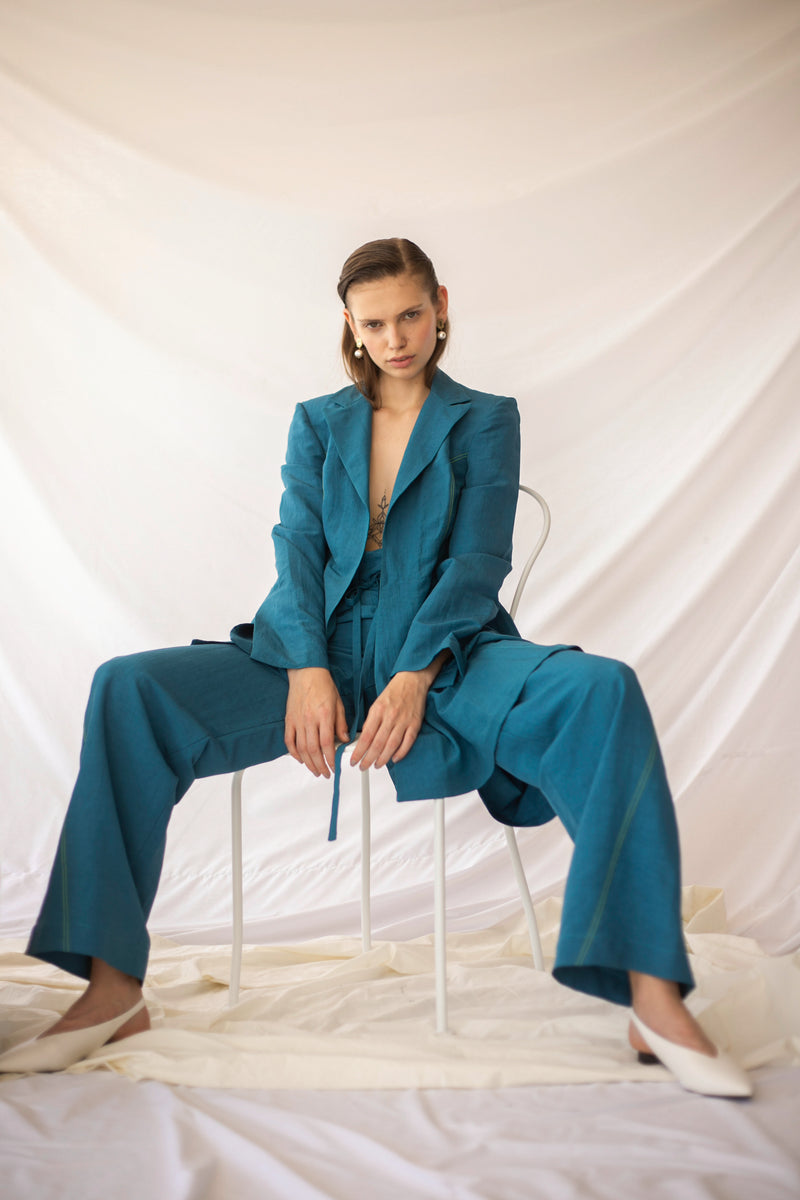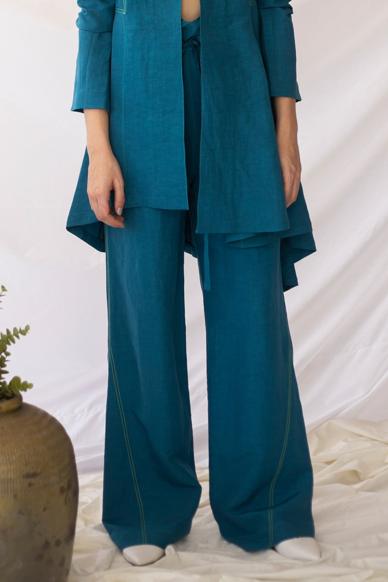 Pantalón pierna ancha y recta en lino con modal. Esta mezcla permite que el material sea liviano y a la vez no se arrugue como el lino tradicional. Cintura alta con fruncido y lazo. Bolsillos laterales amplios. Detalle volante en pretina cintura.