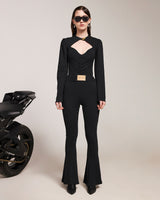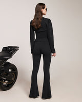 Pantalones en tejido de punto, tiro alto y pierna campana. Pretina ancha elasticada con logotipo de cuero.