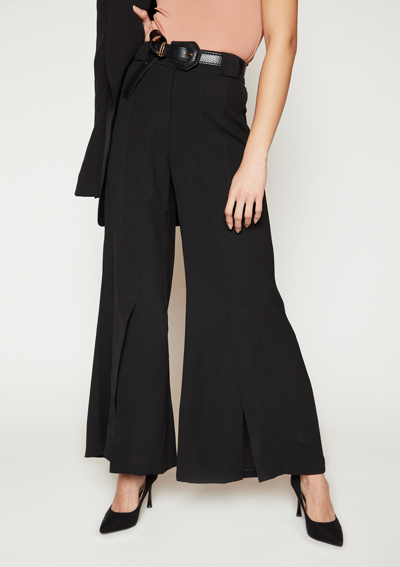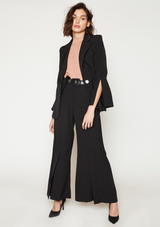 Pantalón en crêpe, corte palazzo abertura pierna. Cierre frontal broches y botón metálico. Disponible en negro y marfil.