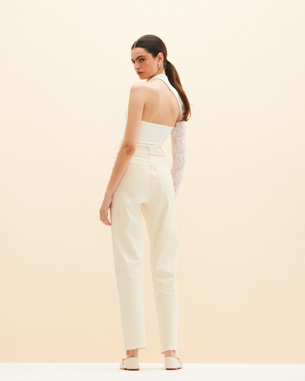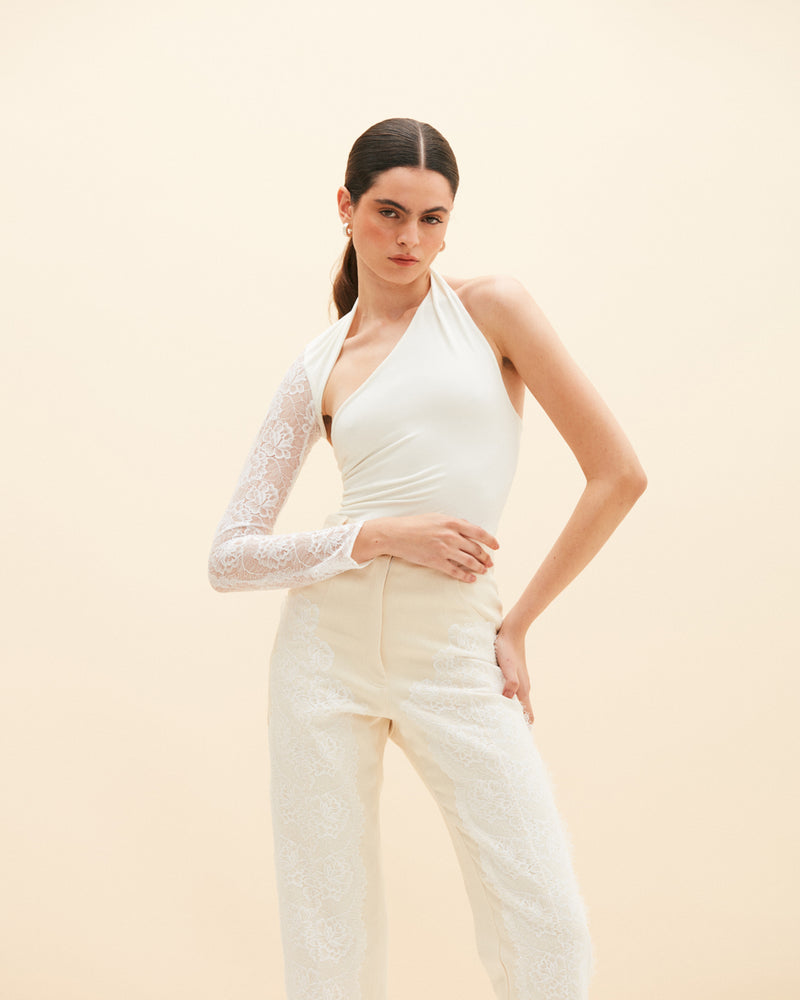 Body asimétrico en lycra, de una sola manga en encaje elasticado. Cierre en entrepierna con broches a presión.