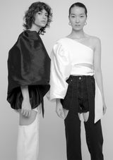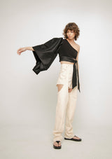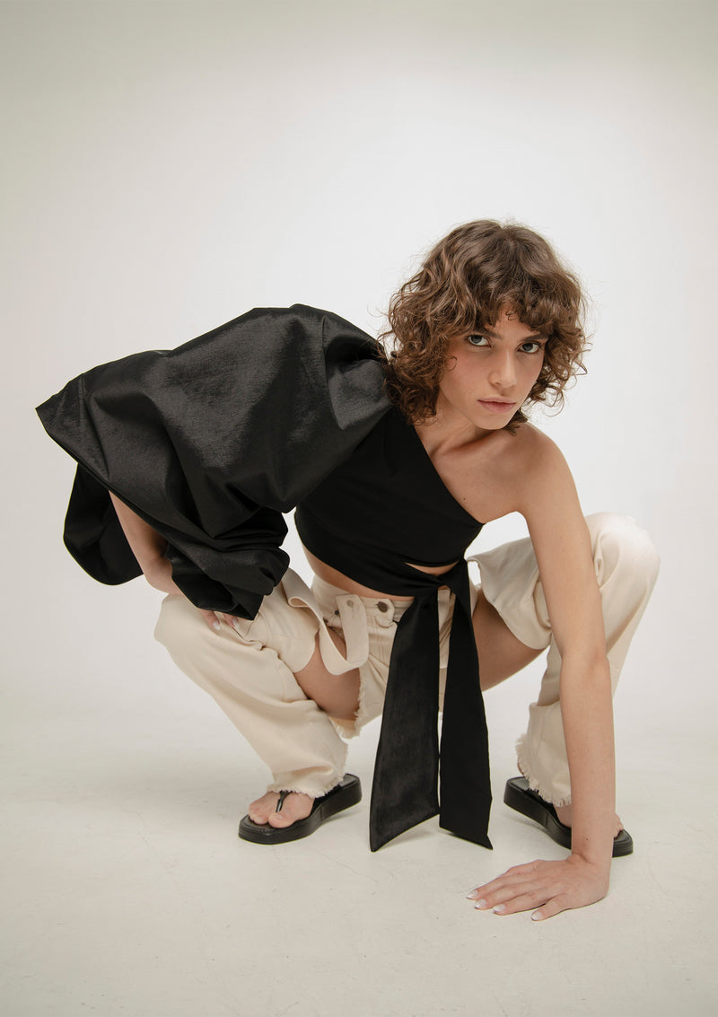 Crop top asimétrico de un hombro descubierto y una maxi manga. Detalle de amarras para rosetón.