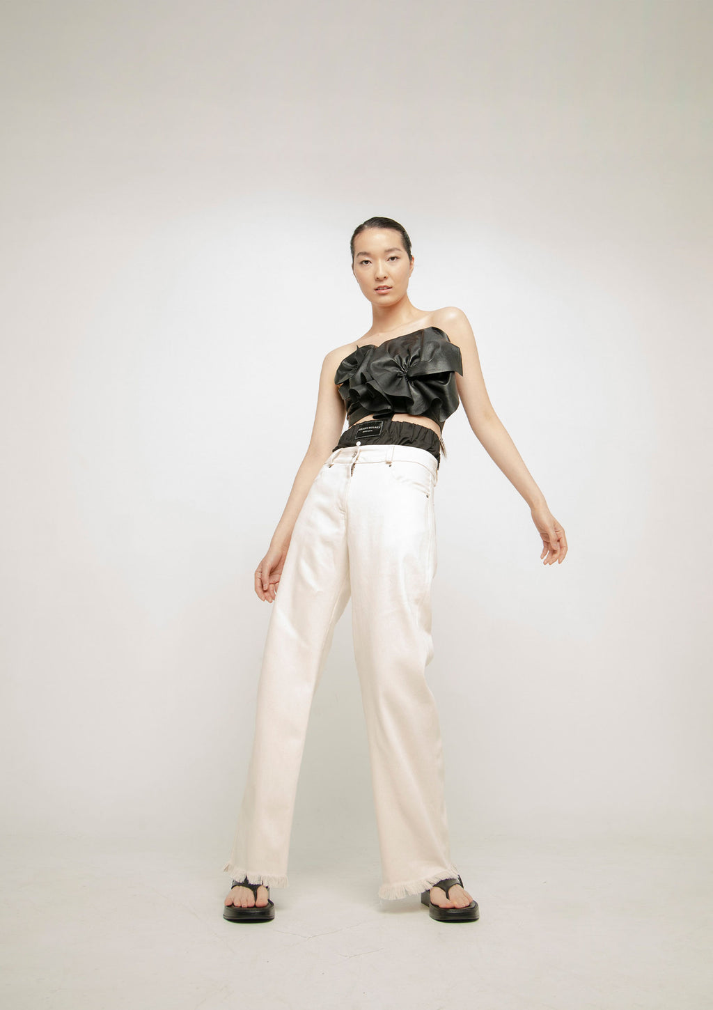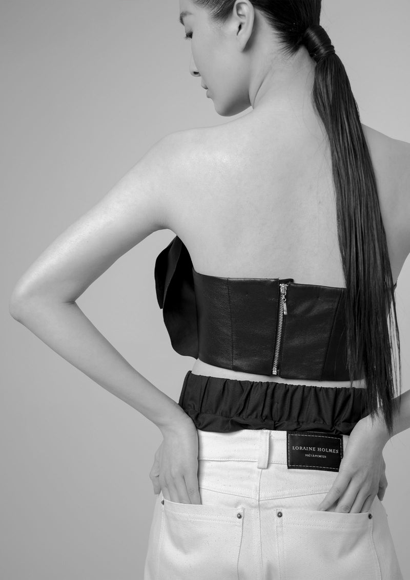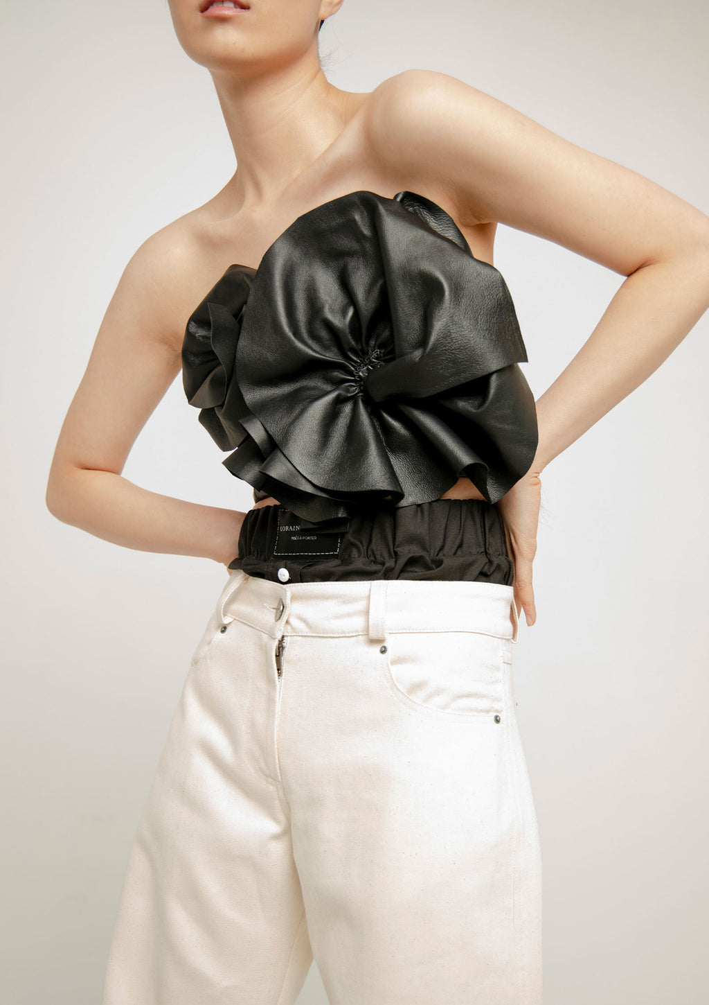 Crop top en cuerpo con volantes. Barbas laterales. Apertura posterior con cierre metálico.