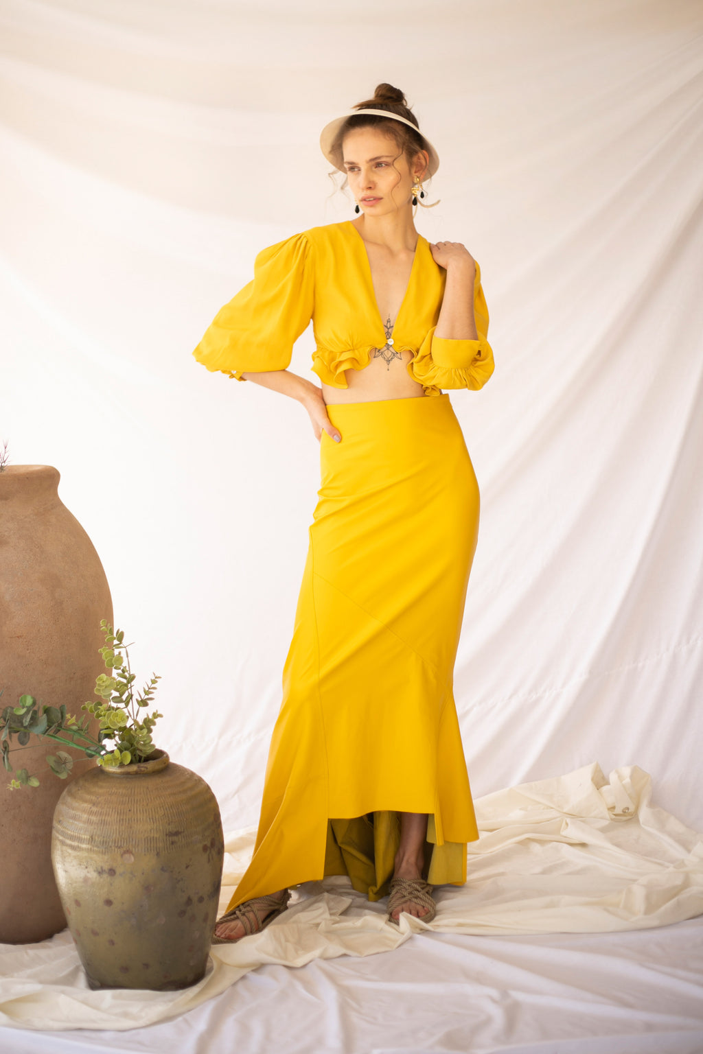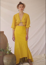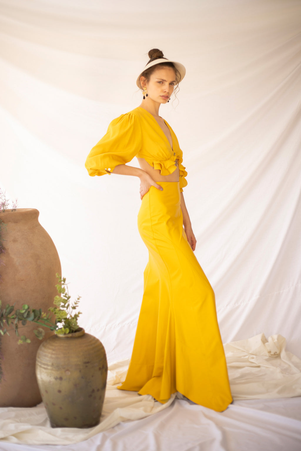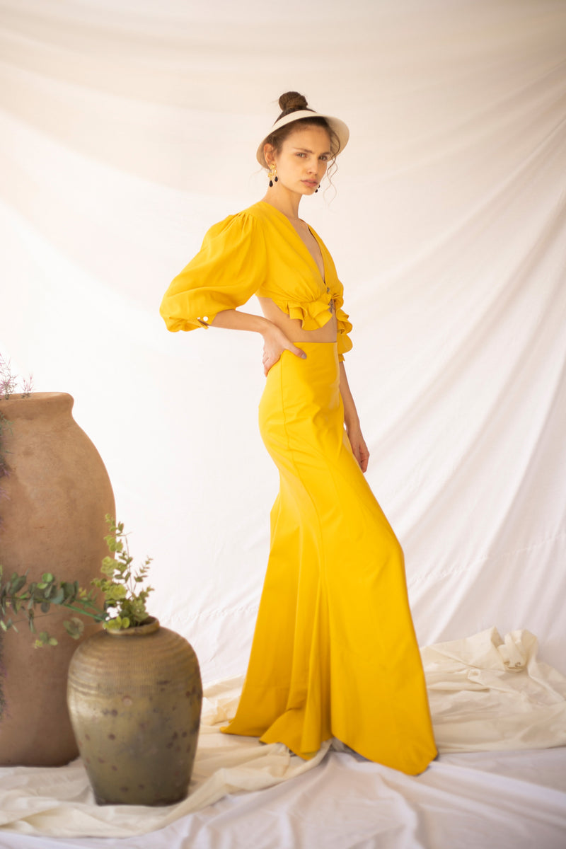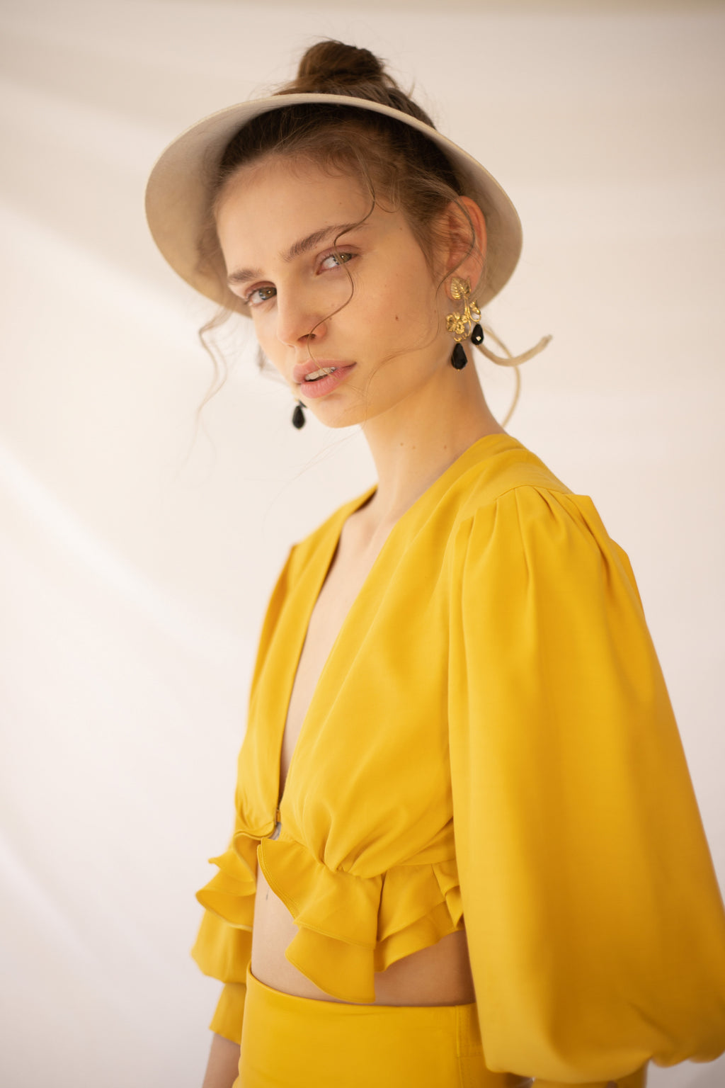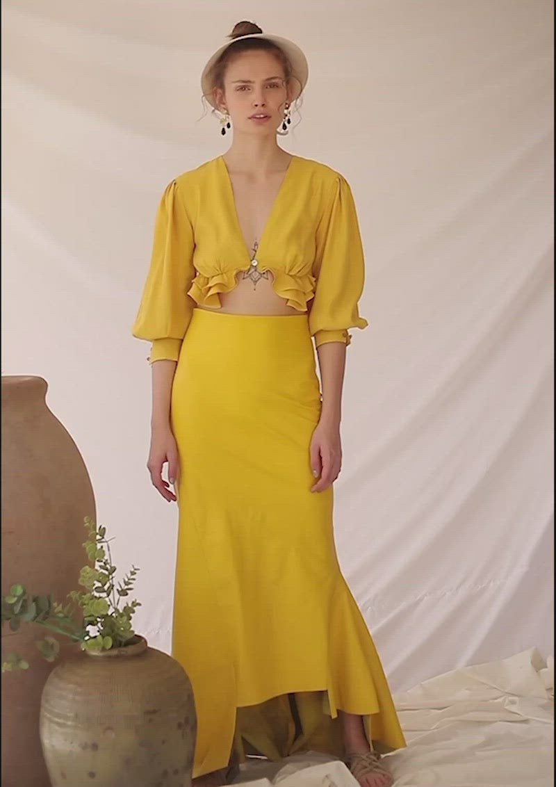 Crop top en viscosa con mangas abombadas ¾. Escote en V. Cierre con botón de nácar delantero. Detalle pliegues y volantes bajo pecho.