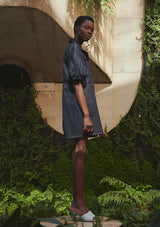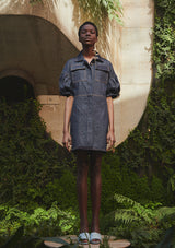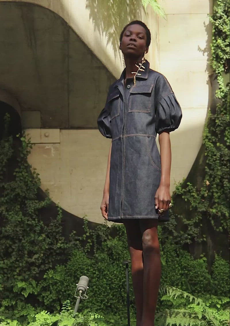 Vestido de jeans, manga amplia y abullonada. hombros caídos y silueta acinturada. Cierre con botones metálicos en delantero. Pespuntes a contraste y bolsillos laterales.