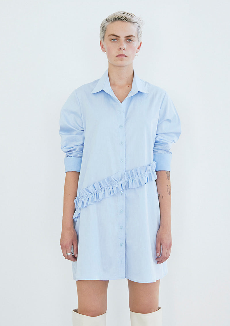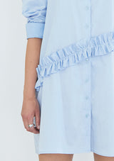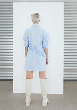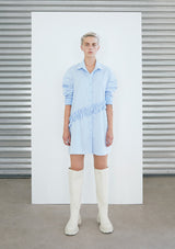 Camisa-vestido en algodón, mangas largas. Apertura frontal con botones, detalle de corte diagonal con vuelos. Pabilo delgado en costados a la altura de la cintura para amarrar y resaltar la figura. Puede amarrarse hacia delante o hacia atrás.