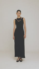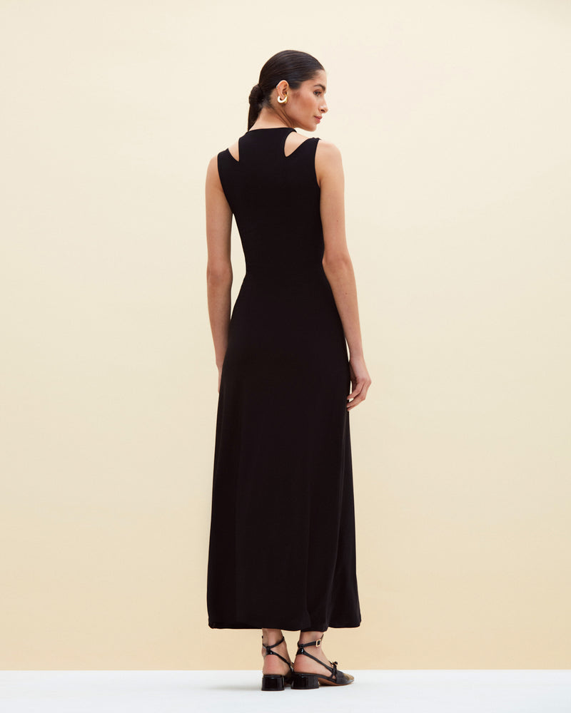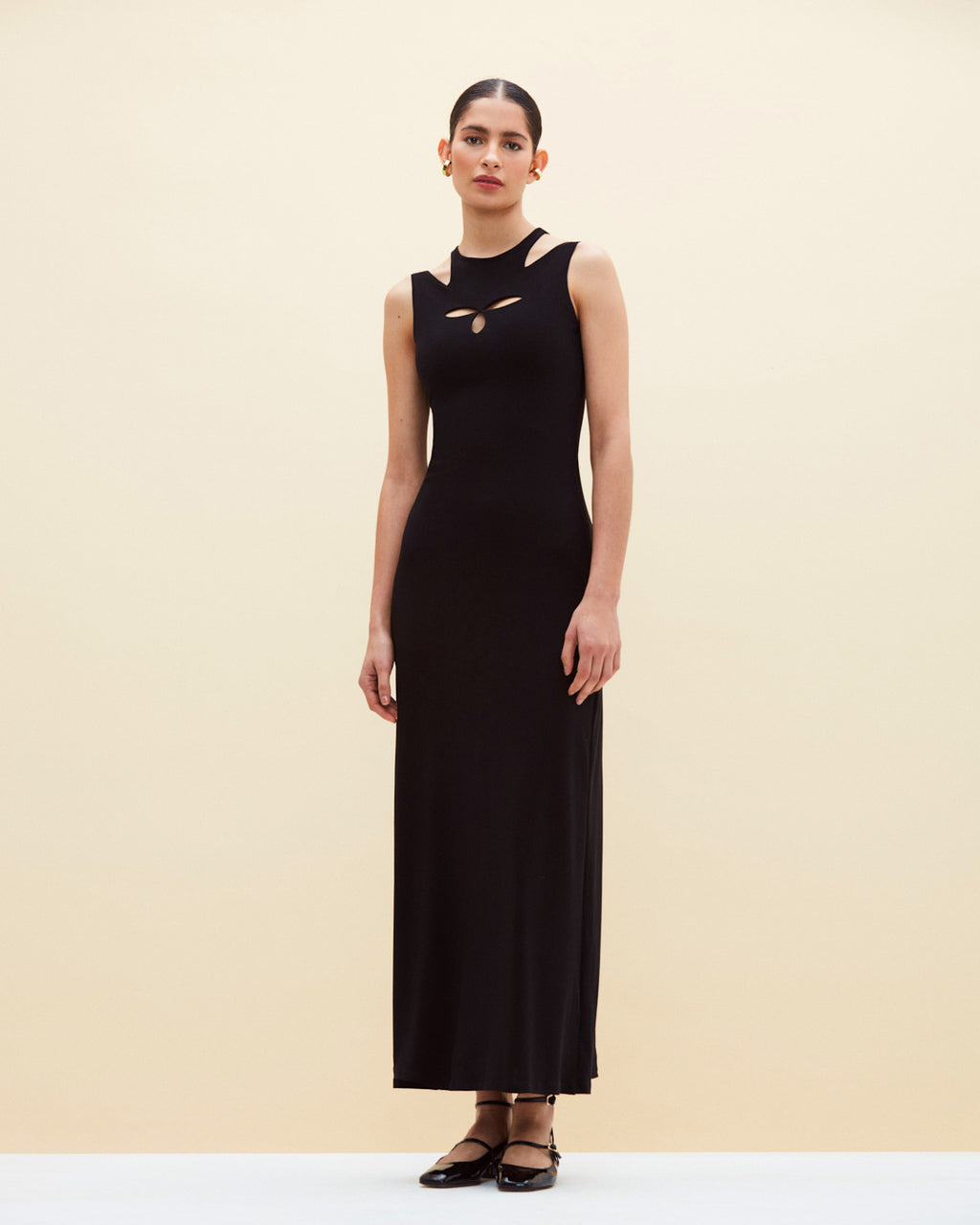 Vestido largo en lycra sin mangas con escote halter y detalle de abertura en forma de flor.