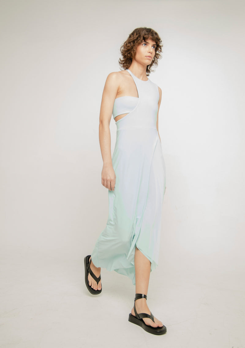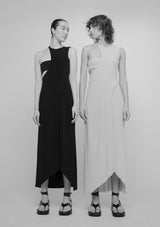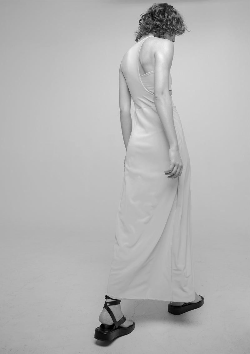 Vestido largo en lycra, de forma asimétrica y sin mangas. Detalles de tull elasticado en faldón inferior.