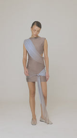 Vestido mini en lycra elasticada sin mangas y con hombreras. Detalle drapeado en malla con estampado degradé.