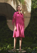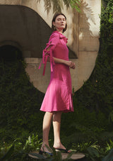 Vestido midi en lino con modal. Esta mezcla permite que el material sea liviano y a la vez no se arrugue como el lino tradicional. Cierre lateral cremallera invisible. Detalle en maxi cuello con vuelos y amarras en magas.