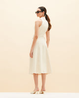 Vestido midi sin mangas en gabardina. Escote en V con solapa. Bolsillos laterales y tapas bolsillo fantasía en delantero. Detalle costuras en forma de sujetador en busto. Cierre frontal con botones tapados.