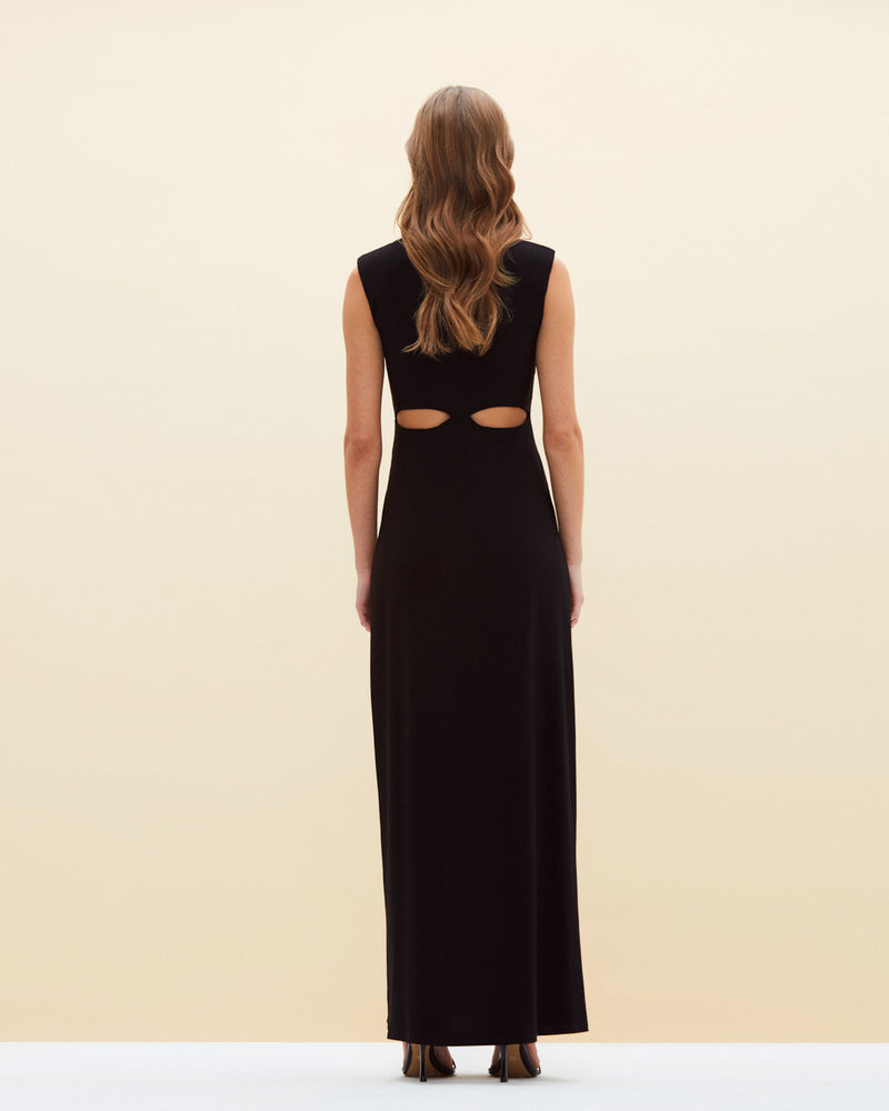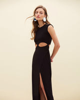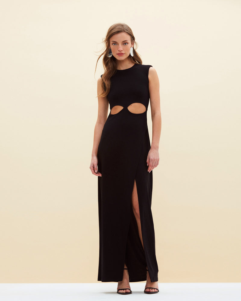 Vestido largo en lycra elasticada sin mangas, con hombreras. Detalle de aberturas en bajo busto y pierna.