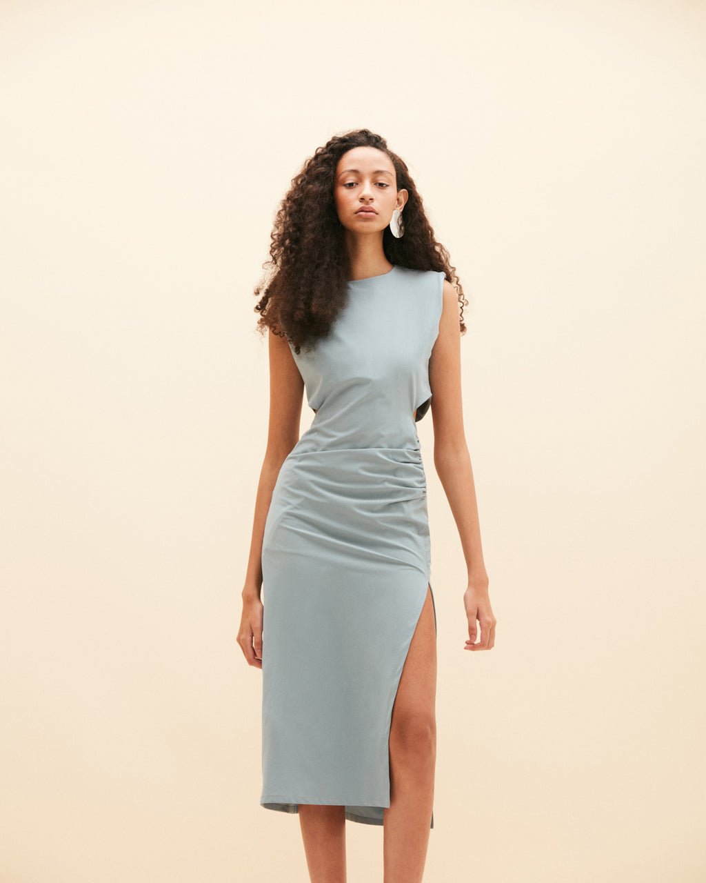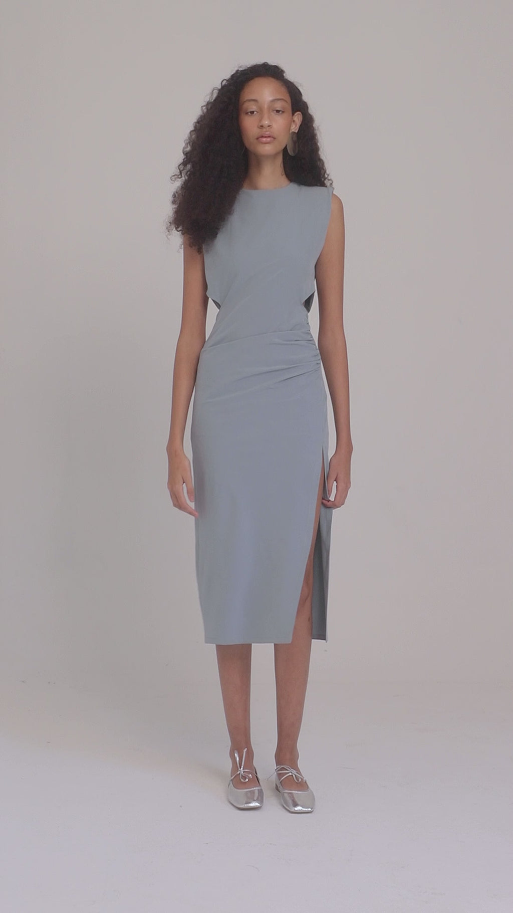 Vestido midi en crêpe, sin mangas, con hombreras, detalle de apertura en los costados y fruncido en lado izquierdo. Abertura en pierna y cierre invisible en la espalda. Incluye accesorio de flor en tela desmontable.